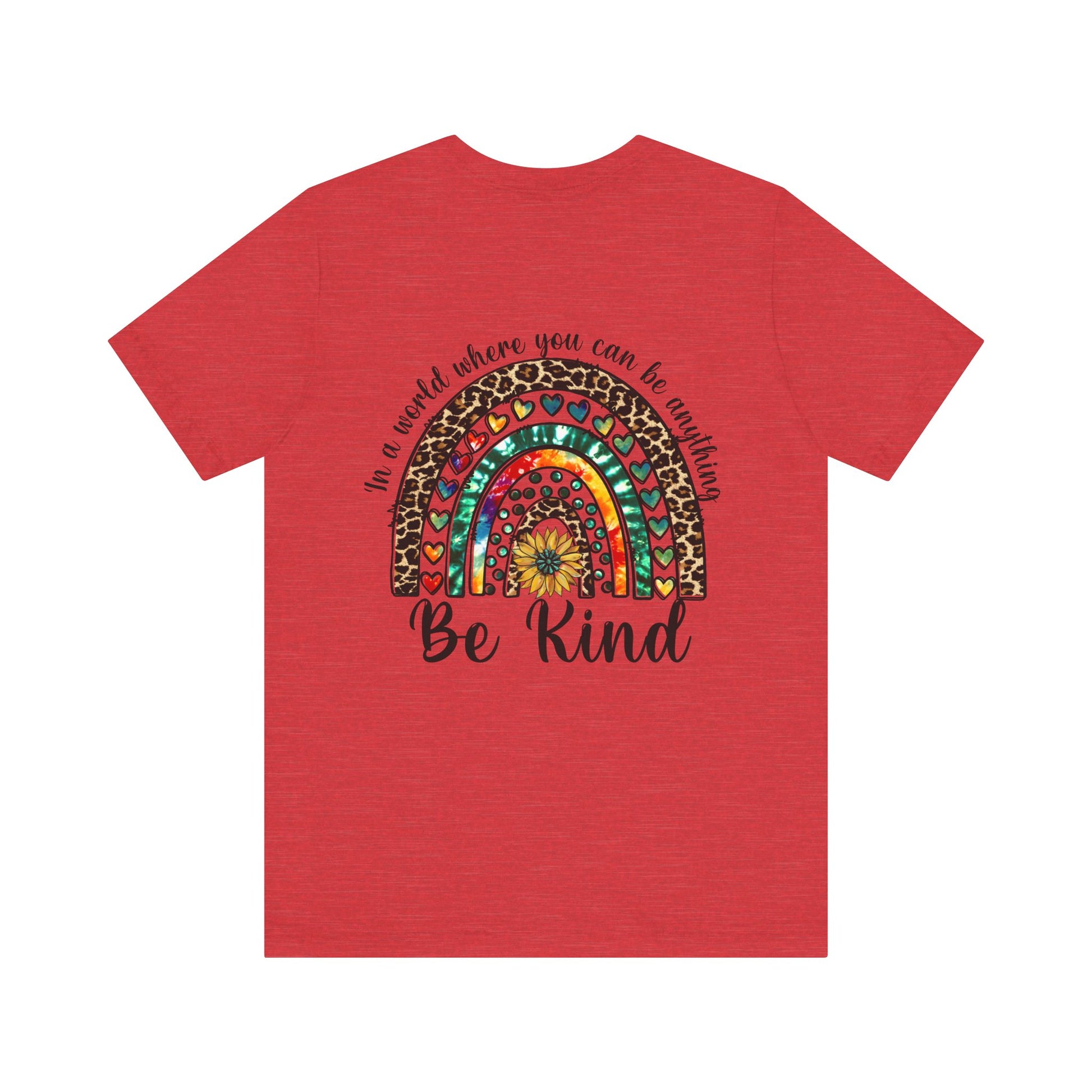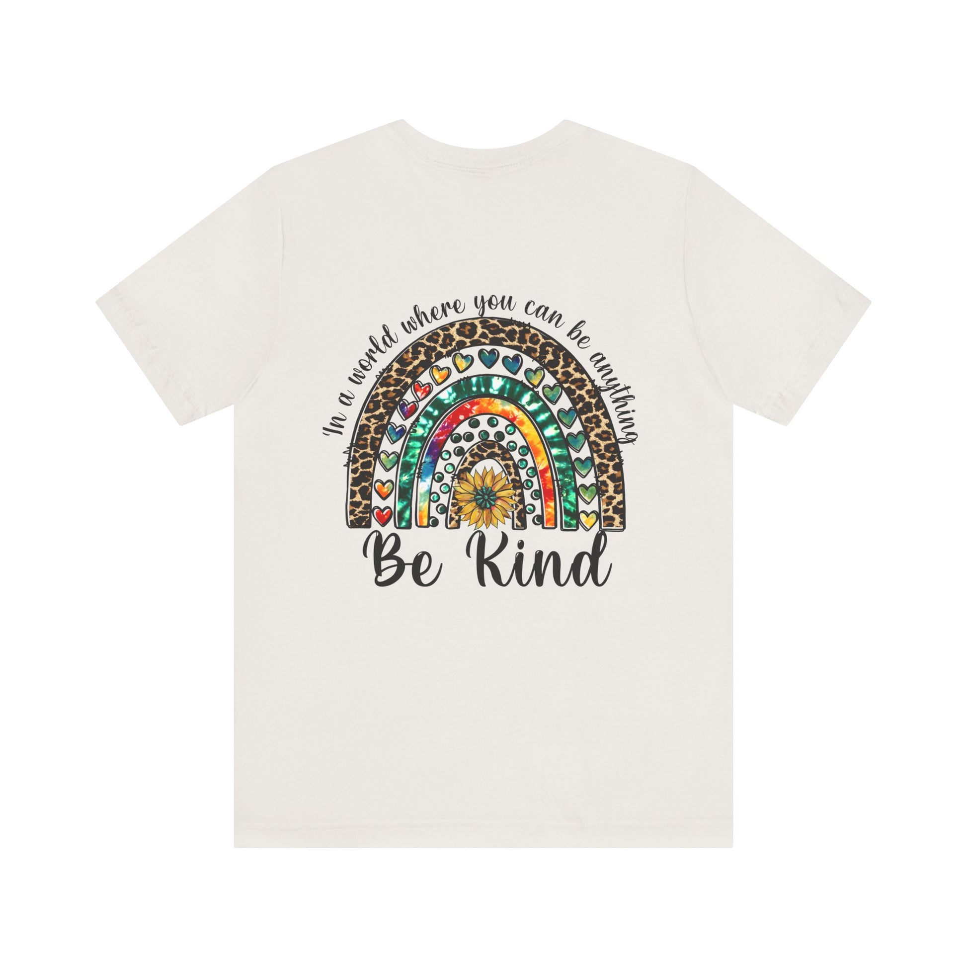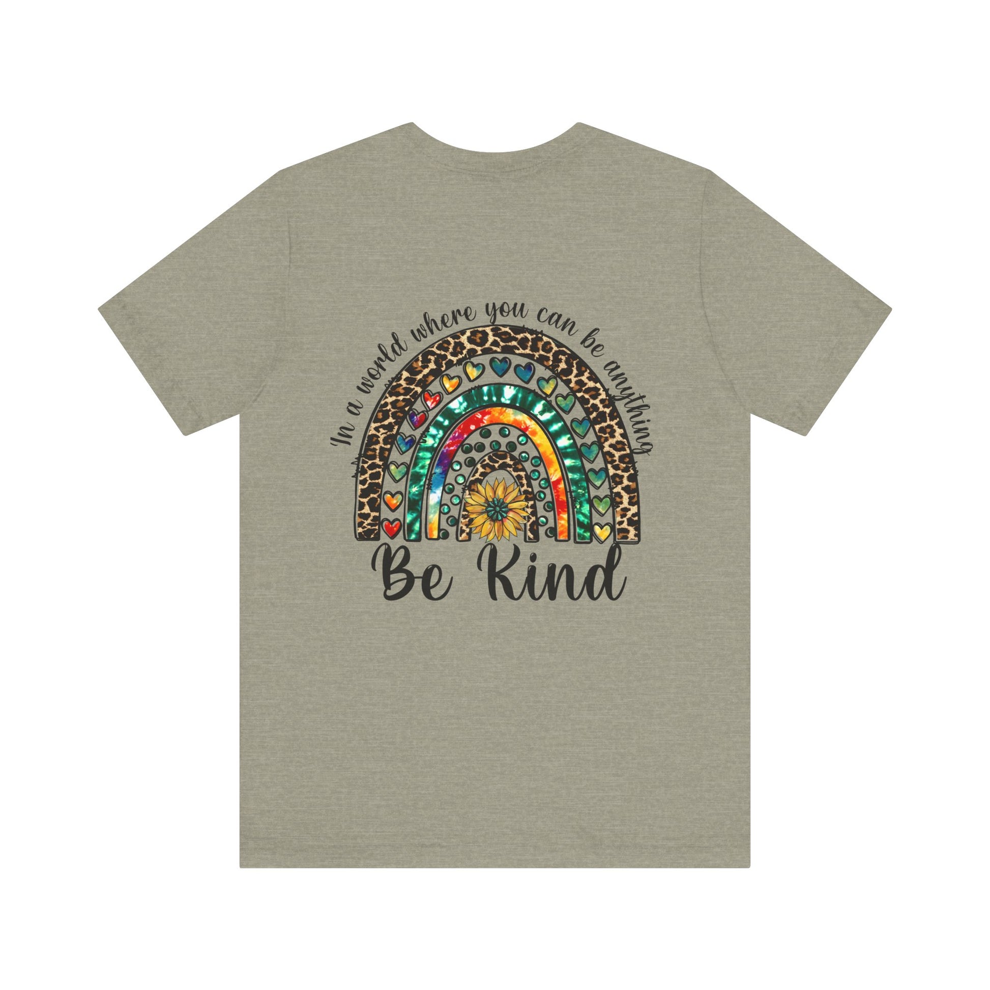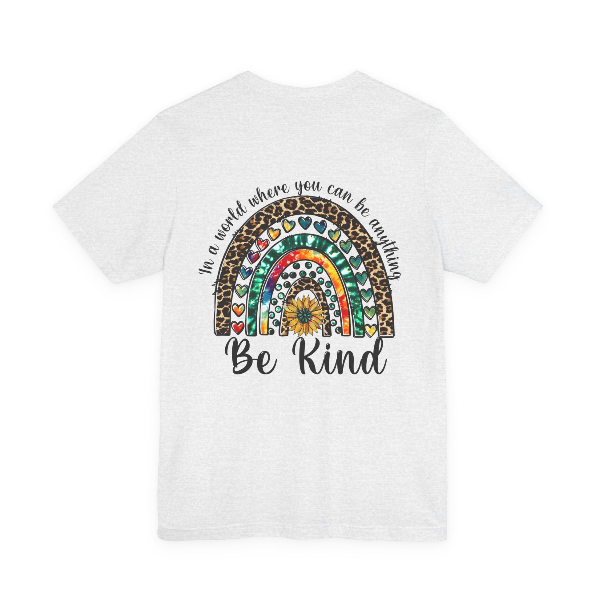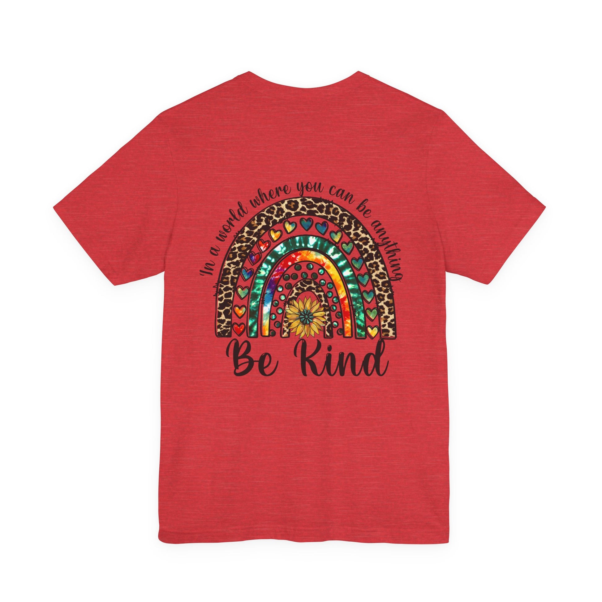 Spread positivity with this comfortable T-Shirt featuring the inspiring message 'In a world where you can be any thing be kind'. Perfect for everyday wear, this unisex tee is made with lightweight, breathable fabric and a retail fit suitable for casual and semi-formal settings. Ideal for adults, this shirt is REACH Certified and sourced from Honduras. Great for layering and accessorizing, this tee is a must-have for those who appreciate a classic, neat style with a message of kindness and positivity. Relevant for everyday wear, casual outings, and gifting occasions.