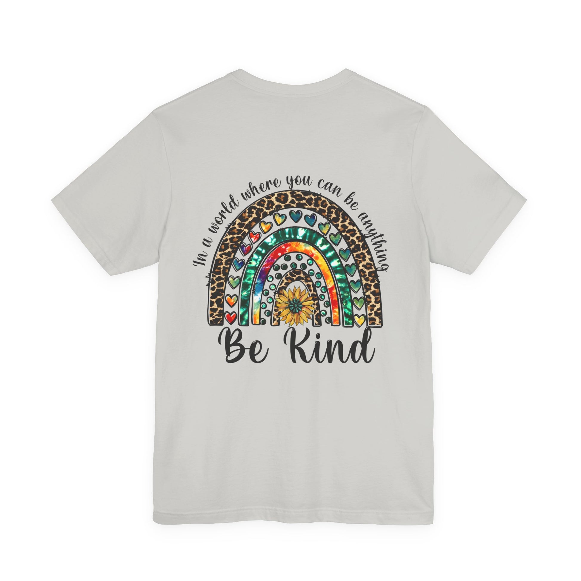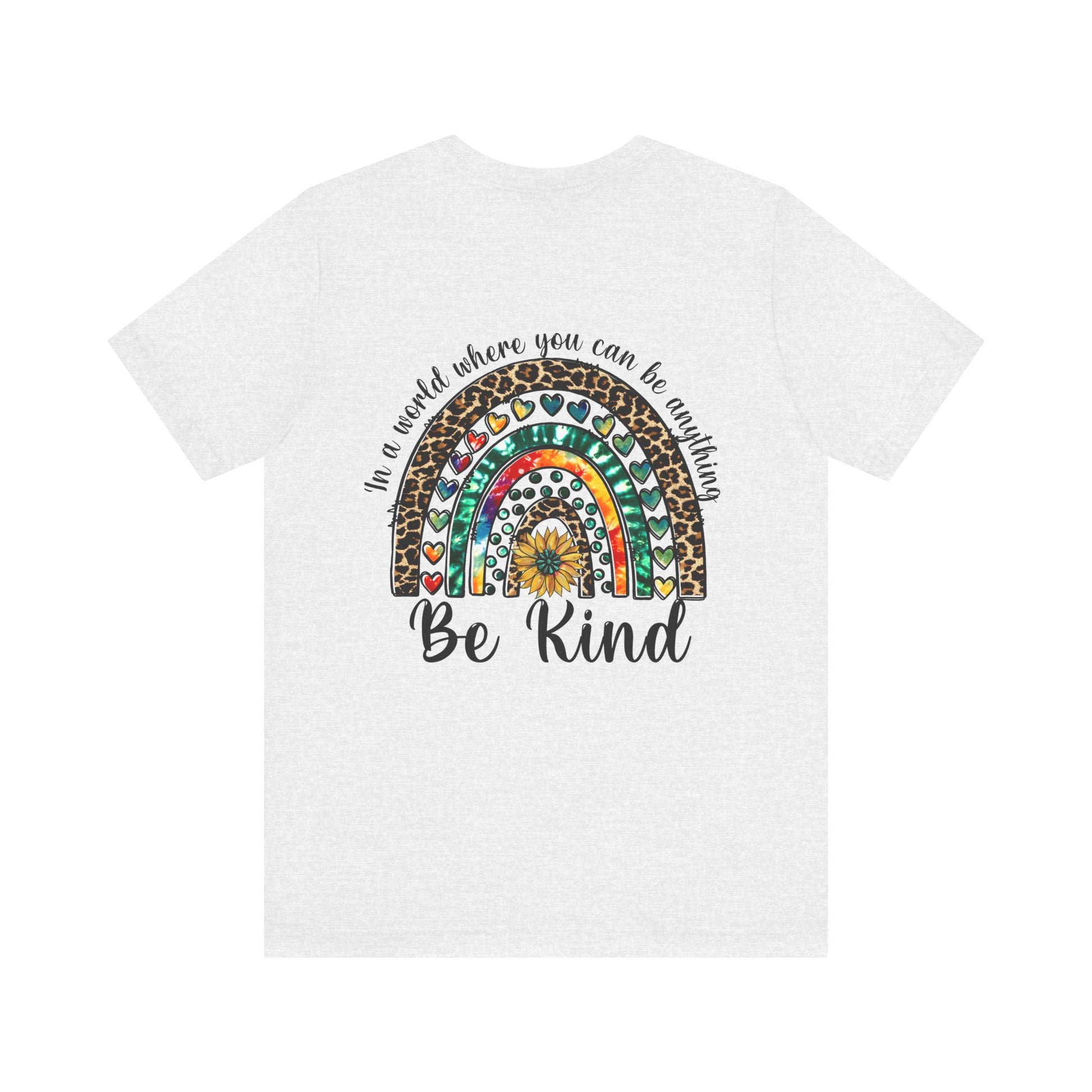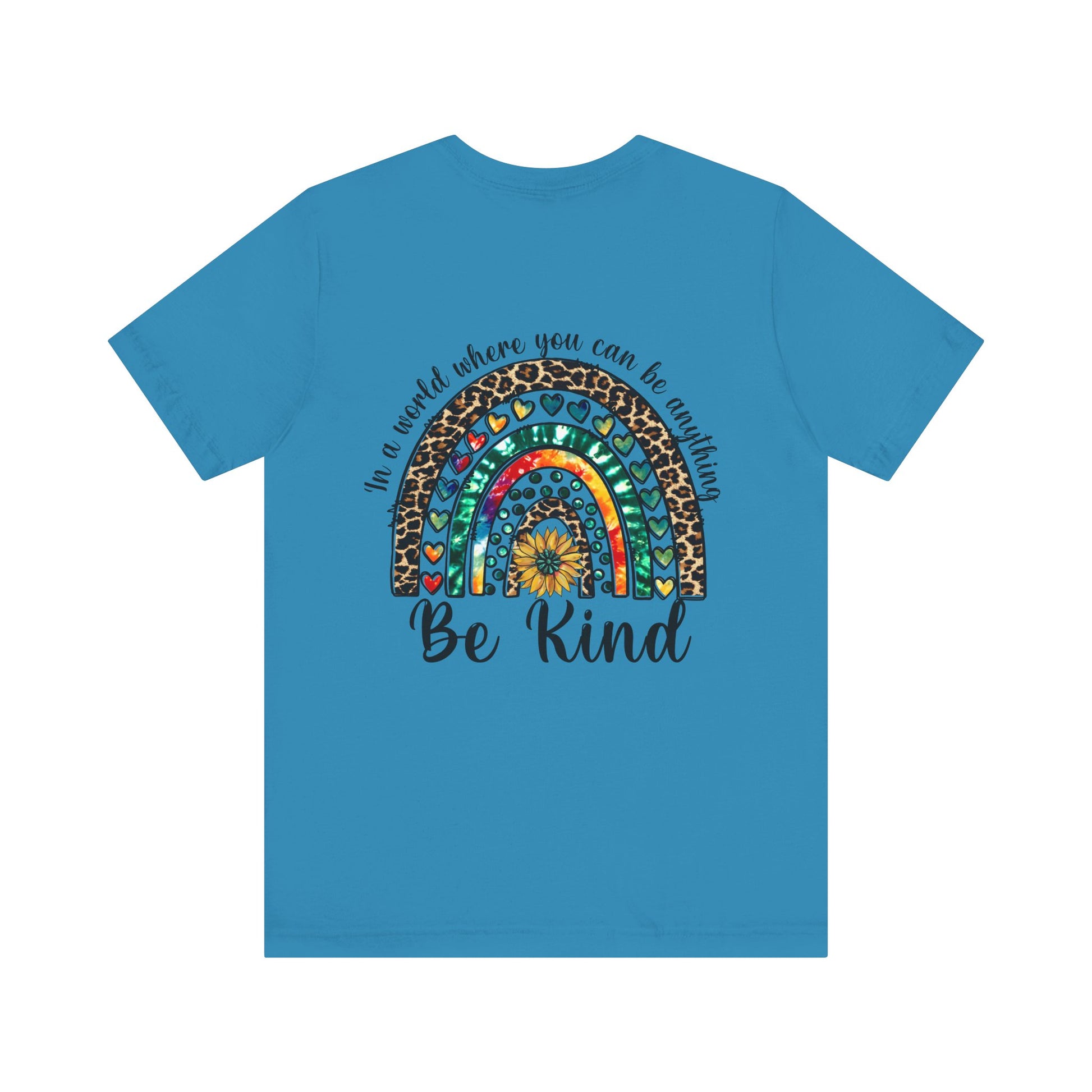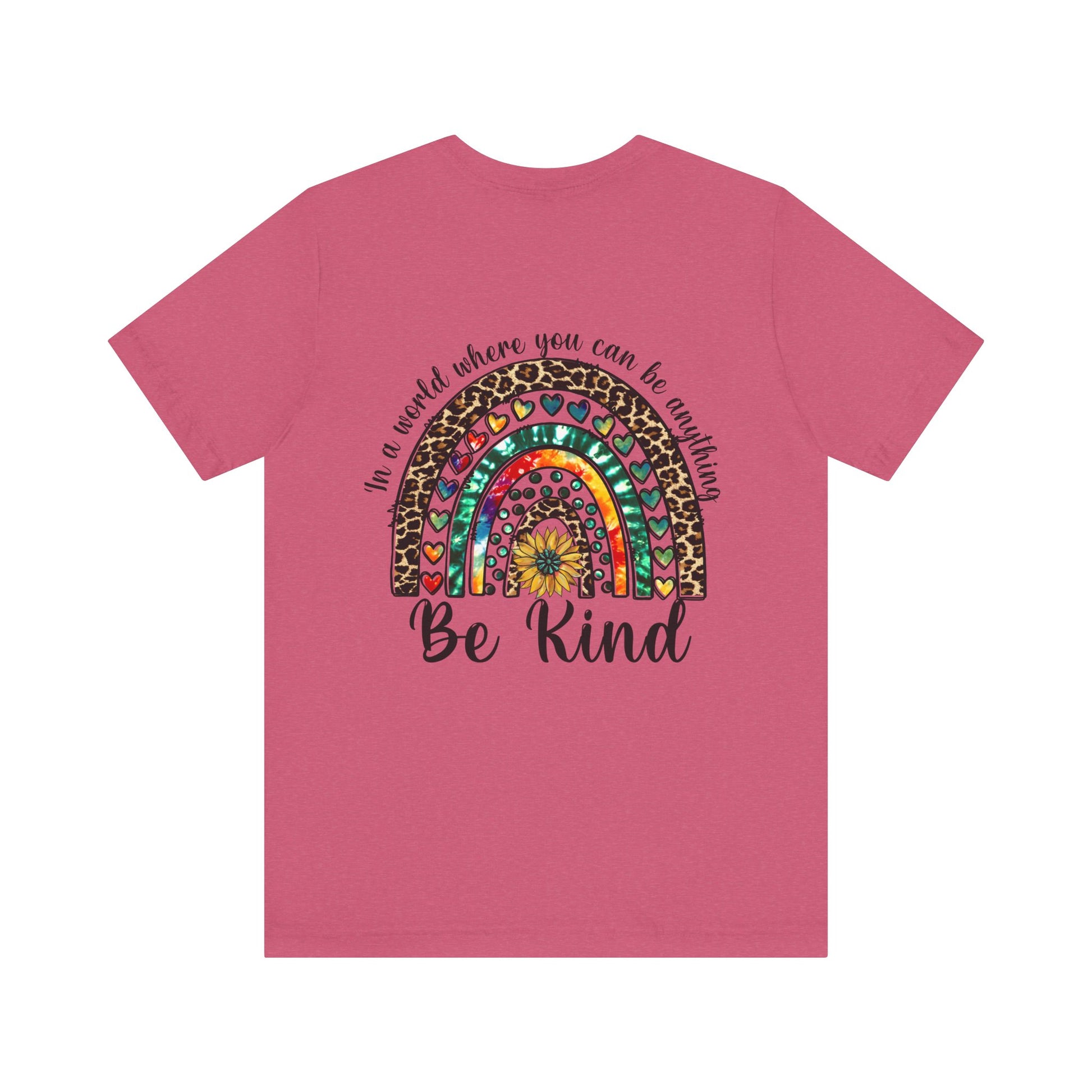 Spread positivity with this comfortable T-Shirt featuring the inspiring message 'In a world where you can be any thing be kind'. Perfect for everyday wear, this unisex tee is made with lightweight, breathable fabric and a retail fit suitable for casual and semi-formal settings. Ideal for adults, this shirt is REACH Certified and sourced from Honduras. Great for layering and accessorizing, this tee is a must-have for those who appreciate a classic, neat style with a message of kindness and positivity. Relevant for everyday wear, casual outings, and gifting occasions.