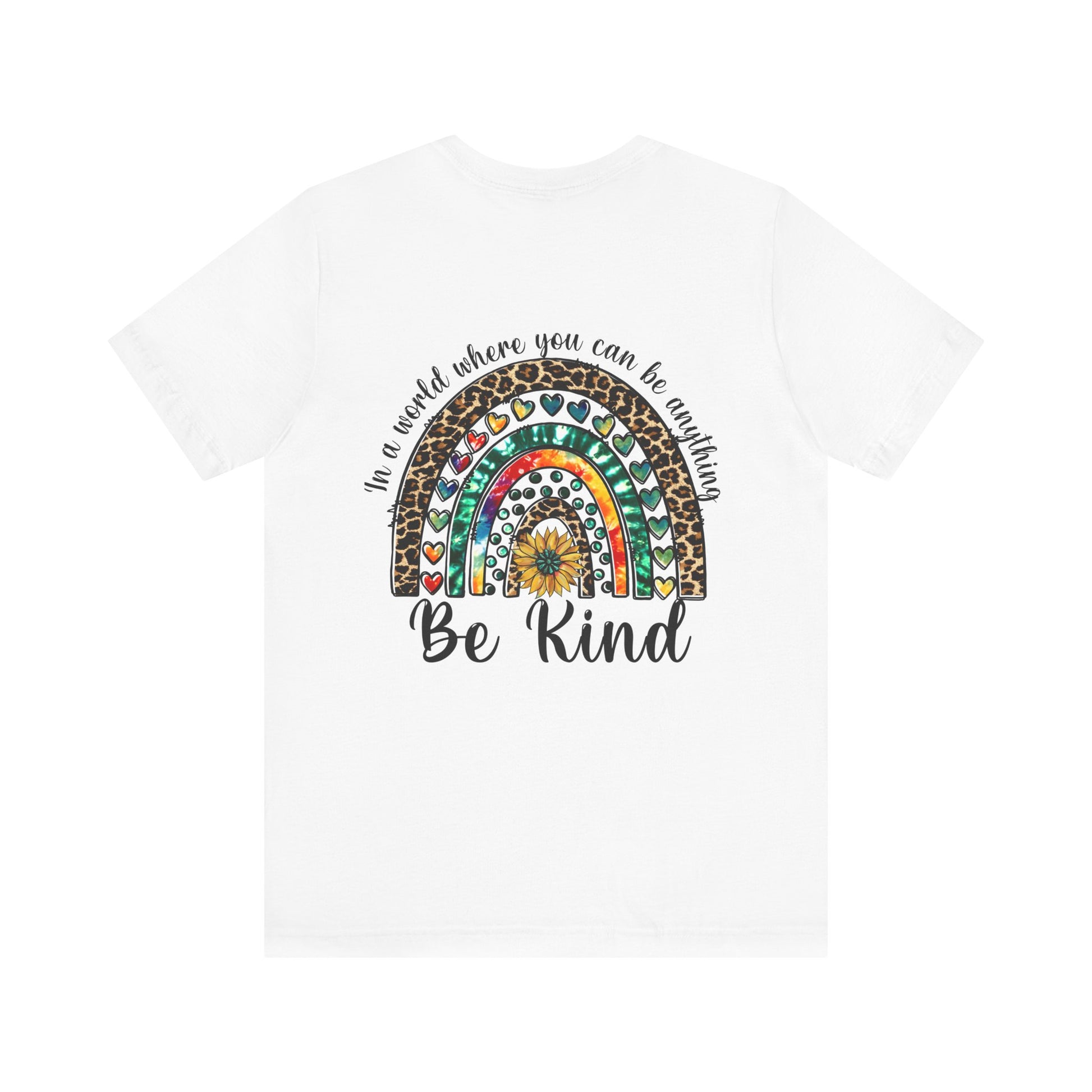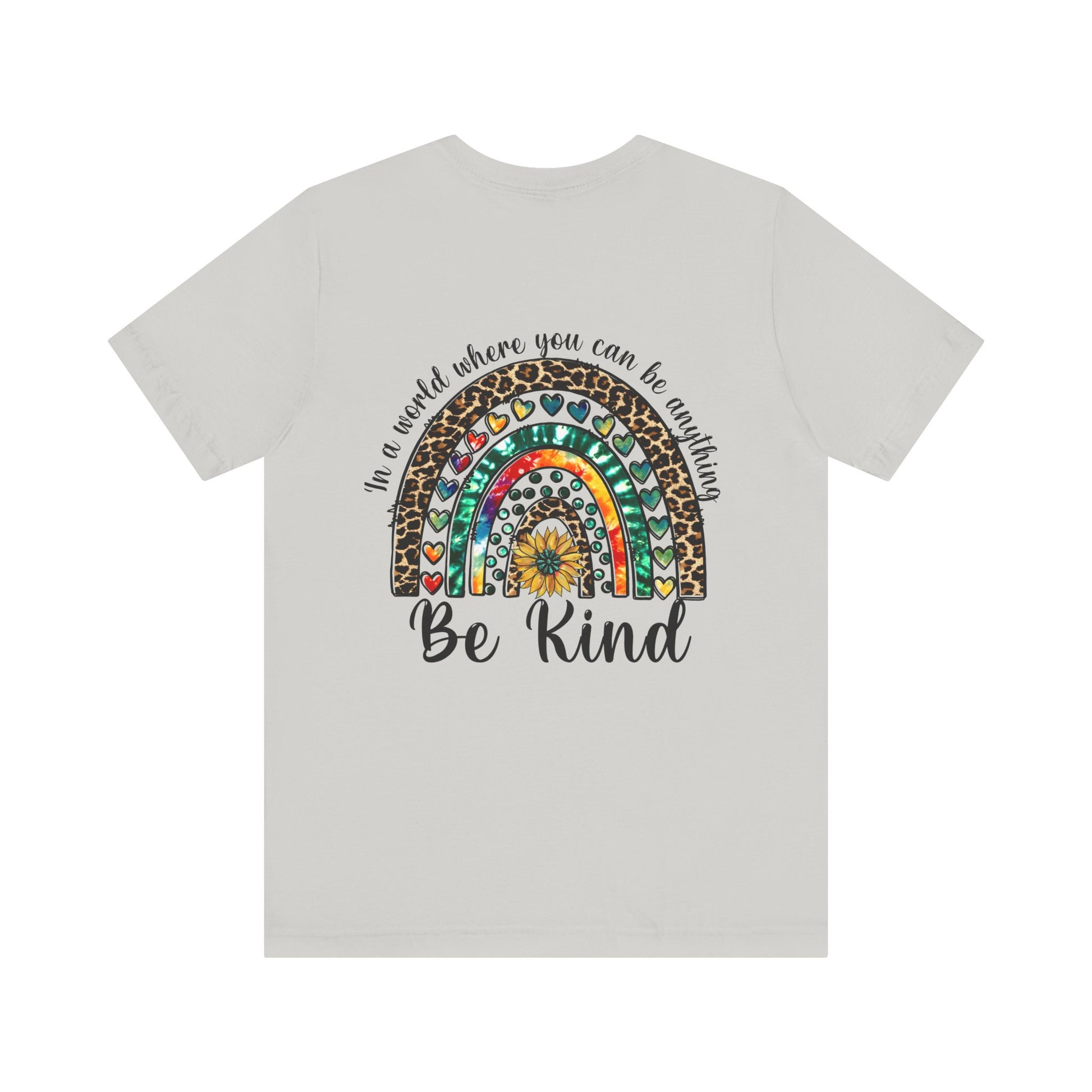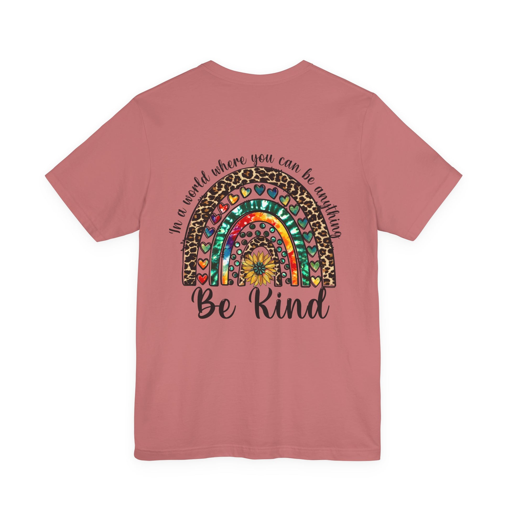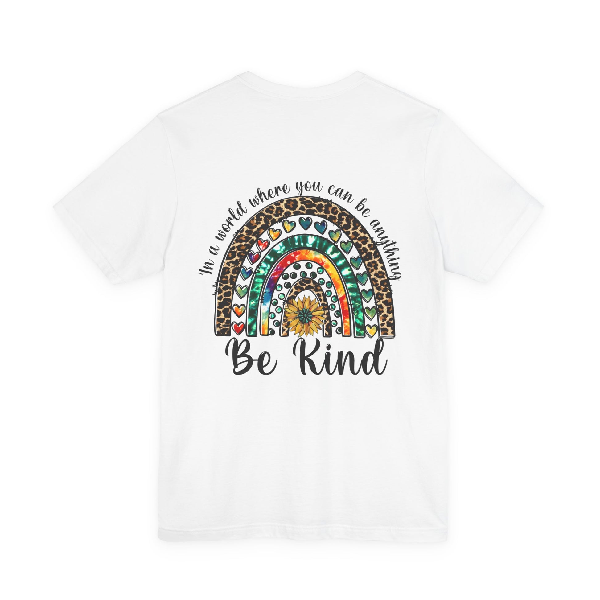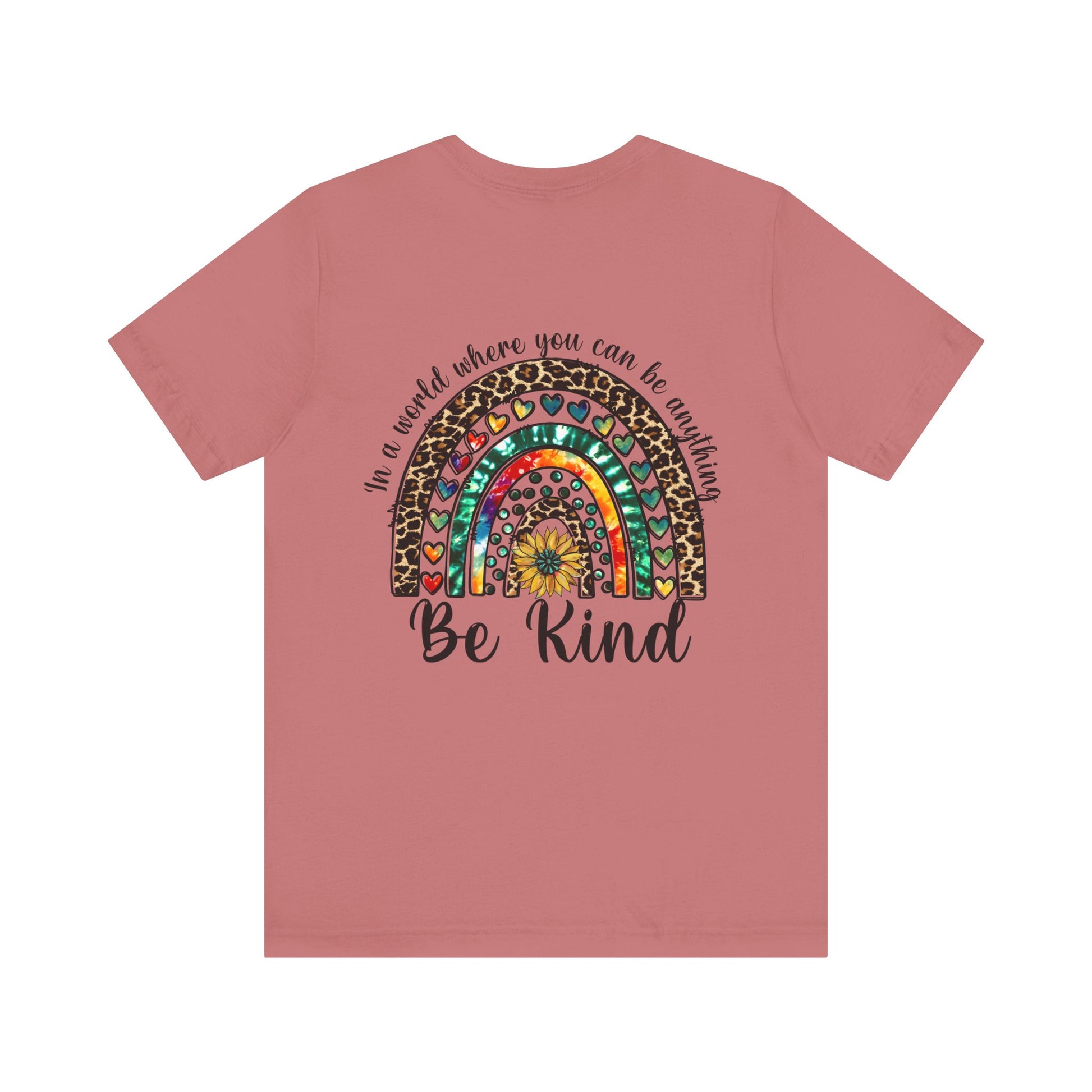 Spread positivity with this comfortable T-Shirt featuring the inspiring message 'In a world where you can be any thing be kind'. Perfect for everyday wear, this unisex tee is made with lightweight, breathable fabric and a retail fit suitable for casual and semi-formal settings. Ideal for adults, this shirt is REACH Certified and sourced from Honduras. Great for layering and accessorizing, this tee is a must-have for those who appreciate a classic, neat style with a message of kindness and positivity. Relevant for everyday wear, casual outings, and gifting occasions.
